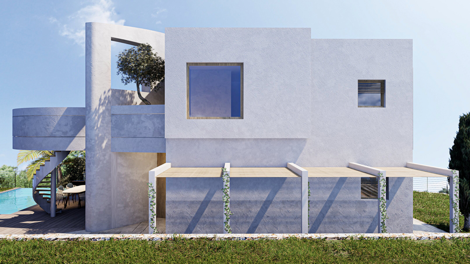 Volumi Puri e Lineari: L’edificio si distingue per le sue forme geometriche essenziali, enfatizzate da superfici intonacate di colore chiaro che catturano la luce del sole.